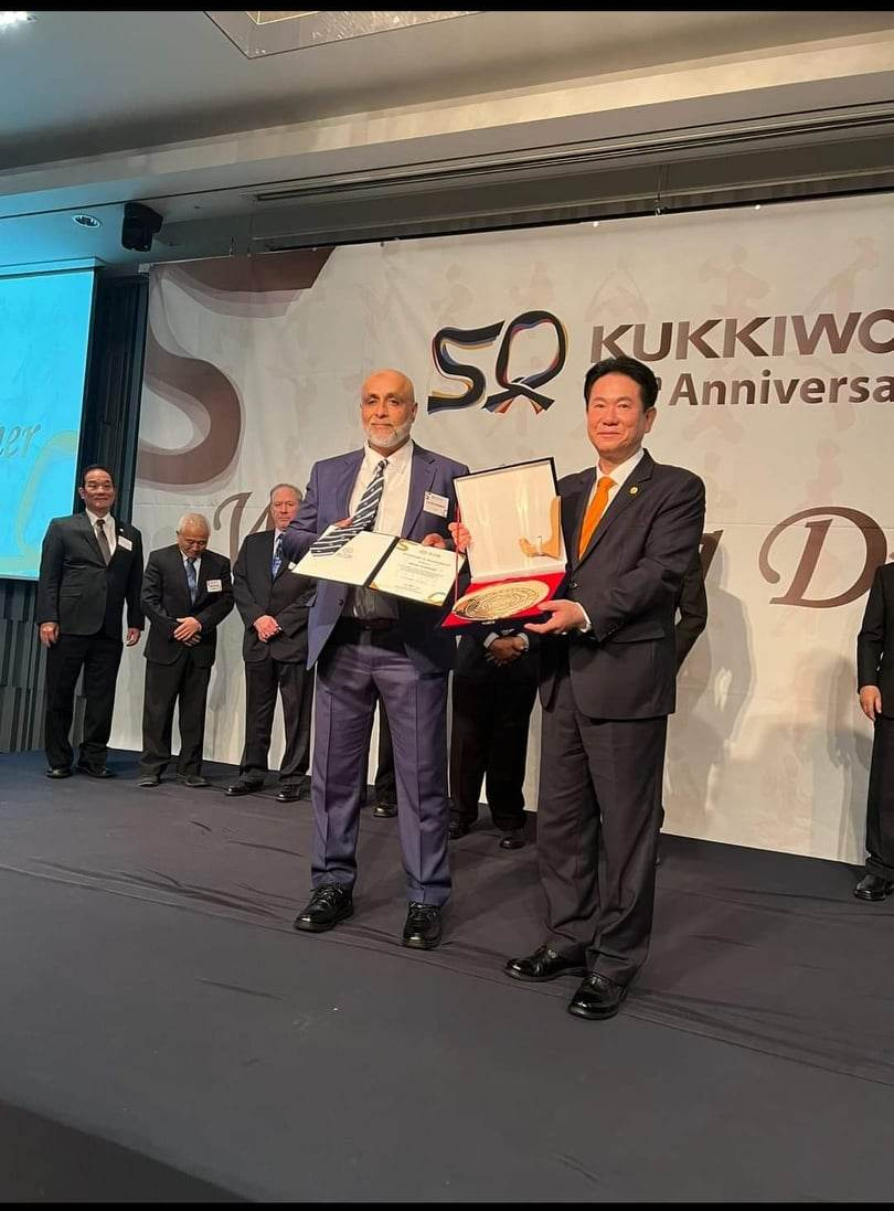 Grand Master Ansar Mahmood receiving the 50th Anniversary Award of the Kukkiwon from the President of the Kukkiwon in Korea